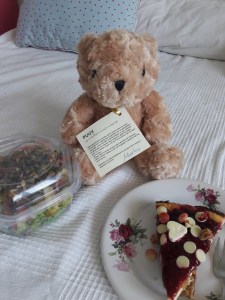 Hoewel ik onverwacht langs kwam (voor zover je standaard 2x per week onverwacht kunt noemen) kreeg ik vandaag een beertje bij mijn gerookte zalmsalade en mijn cheesecake.