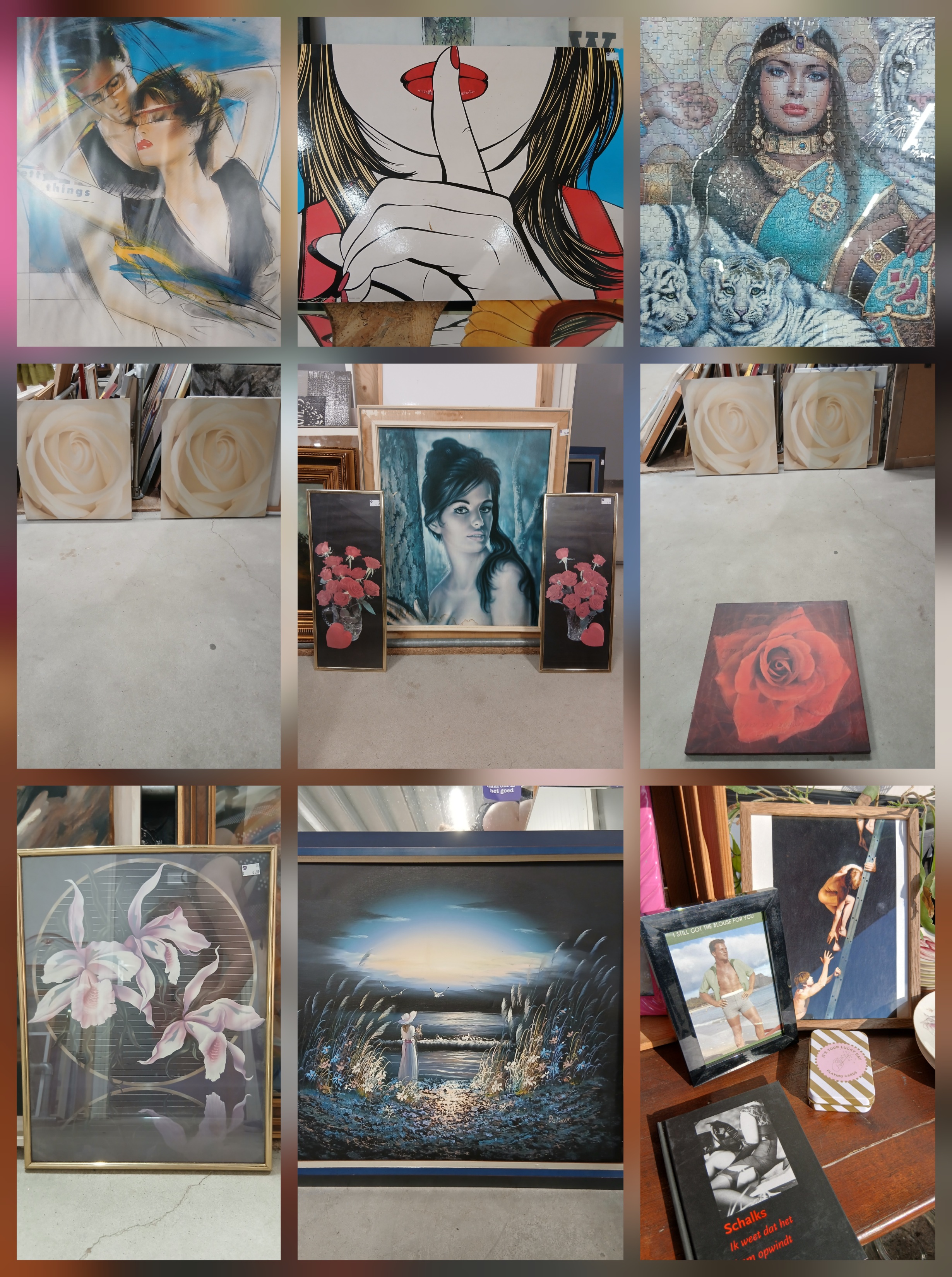 Hier zijn we in de hal. De muur is gedecoreerd met een ingelijste Verkerke poster uit de jaren 80 en pop-art (dit zijn de enige twee schilderijen die nu niet meer in t Goed hangen, omdat ik ze heb); Een witte tijgerin-inspired ingelijste puzzel; Schilderij combinaties; Jaren 80 orchydeen in de originele lijst, en het metaforische licht van een tunnel. De laatste foto is een sfeer impressie van onze imaginaire receptie, een foto die vandaag gemaakt is bij de bus van Tweedehans Nijmegen.